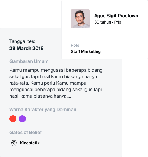 Kami membantu perusahaan untuk mengenali dan memahami karyawan maupun kandidat dengan lebih baik. Dengan memahami mereka, Anda dapat mengoptimalkan potensi mereka dengan lebih efektif agar dapat menjadi aset terbaik perusahaan.