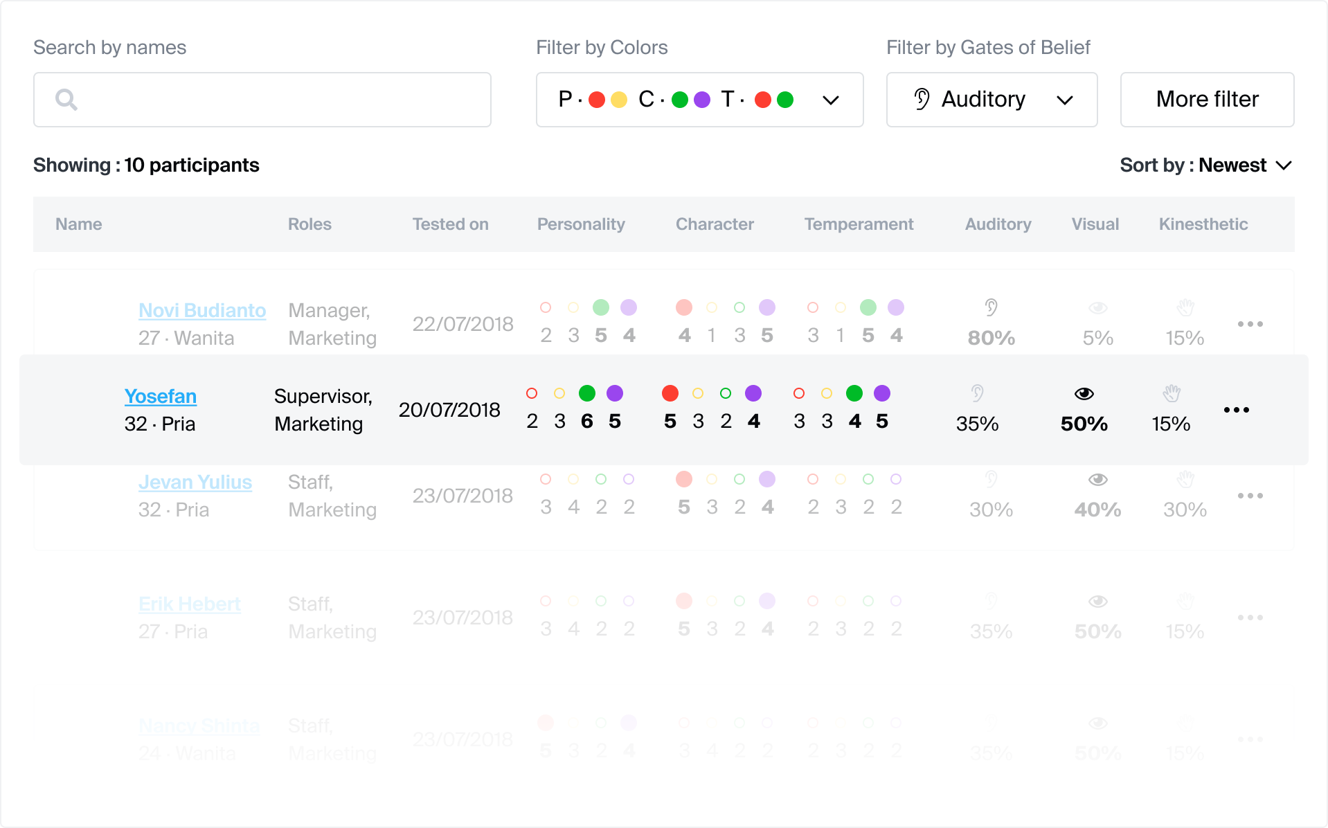 Filtering digunakan untuk menemukan kombinasi warna dominan tertentu pada Personalitu, Karakter, maupun Temperamen. Sedangkan Sorting membantu Anda mengurutkan data partisipan berurutan dari angka yang paling kecil ke paling besar, atau sebaliknya.